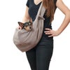 スリングタイプのキャリーバッグ。 肩にかける部分は幅が広めに作られており、重さが分散され飼い主様の肩への負担を軽減。 内側には飛び出し防止用リードも完備しているので安心。愛犬とどこでも一緒におでかけをお楽しみいただけます。 耐荷重は約8kg。ポリエステルコットンブレンドの、とても柔らかく温かみのある素材を使用しています。 30℃未満のお水で洗濯可能なので、いつでも清潔にお使いいただけます。
