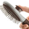 背面のボタンを押すことで、抜けて絡まった毛を簡単に取り除けるピンブラシ。