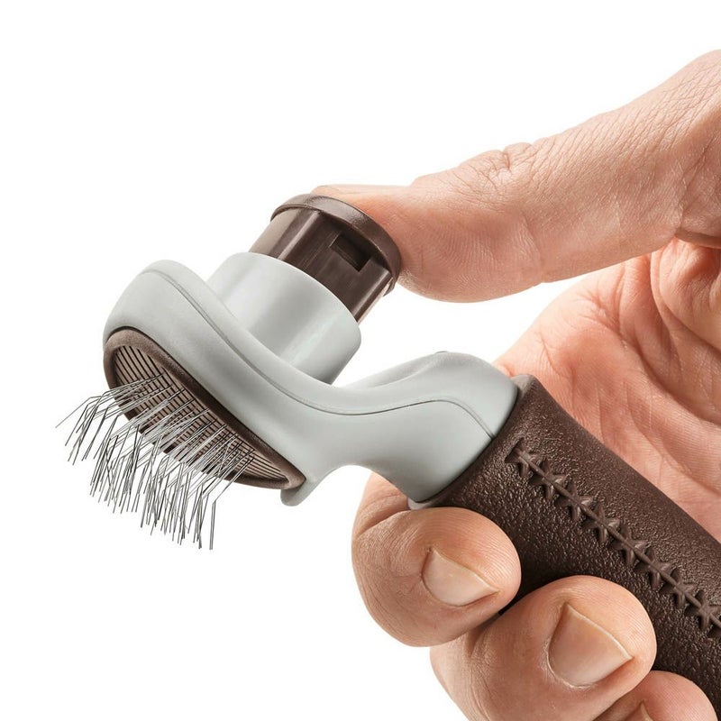 背面のボタンを押すことで、抜けて絡まった毛を簡単に取り除けるスリッカーブラシ。